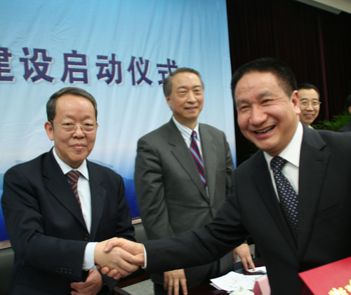 中国APEC研究院建设新址启动仪式上,外交部党委书记、副部长王光亚向陈茂春董事长颁奖