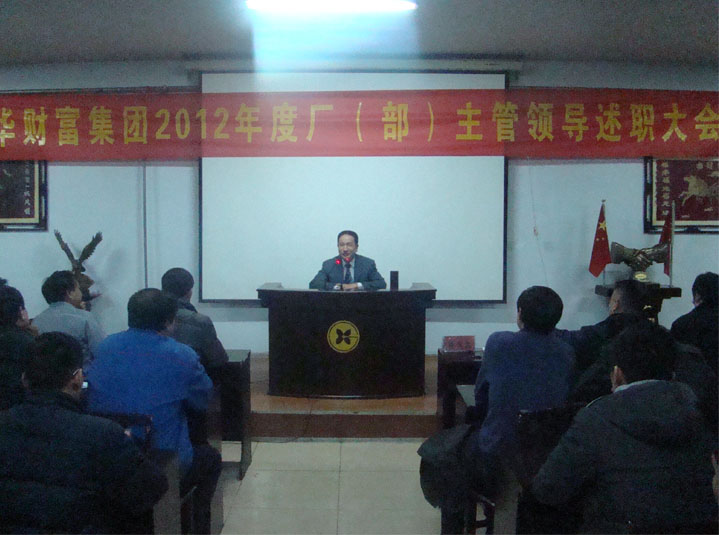 本报讯 1月15日晚19:00,集团公司召开2012年度厂(部)主管领导述职大会。这次集团公司打破常规,创新工作方式,实行厂(部)主管领导述职集中测评,给集团公司厂部领导提供了一次展示自己的机会。集团公司董事长陈茂春、集团公司总经理李福忠、生产副总付新岗、高振伟、行政副总龚少章、总经理助理张贵方、成本总监郭寿福,各厂部科级以上干部共计200余人参加了述职大会。大会由行政副总龚少章主持。