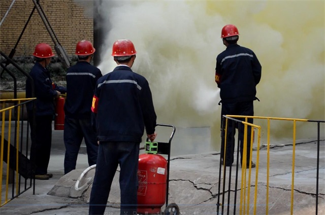 此次模拟制氧车间岗位工设备点巡检至一期氧压机厂房2#氧压机处,发现氧压机三级活塞杆着火,立即通过对讲机上报当班值长,同时果断采取行动,用手提式干粉灭火器灭火,但由于火势大无法控制,岗位工受伤倒地。当班值长立即汇报车间主任,车间主任立即下达命令,启动氧压机着火应急预案。抢险抢修队、治安安保队、医疗救护队、通讯联络组收到命令后各司其职,迅速展开行动,最终在大家的共同努力下伤员得到救治,现场火情也得到了控制,演练圆满结束。
