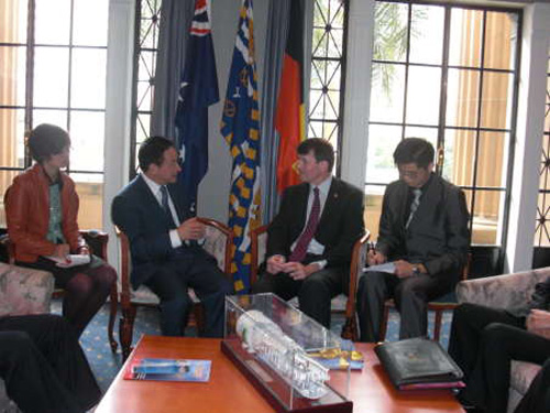 陈茂春董事长抵达澳大利亚昆士兰州首府布里斯班时,受到中国驻布里斯班领事馆总领事任共平先生的亲切接见。参加会见的还有当地知名的会计师事务所、的近律师事务所、澳中贸易商会以及亚洲银行等机构代表。陈茂春董事长向任共平总领事介绍了兴华公司概况和这次商务考察的活动安排。任共平总领事对陈董事长率团来昆州考察交流感到非常高兴,并向陈董事长介绍了昆州的政治、经济、矿产资源、环境等情况,认为当前国际金融危机,是中国企业到海外投资发展的有利时机,兴华公司之举为中澳企业友好合作搭建了良好平台。陈茂春董事长一行还先后受到了昆州自然资源 矿产与能源及贸易部副部长蔡伟民先生,昆州布里斯班市副市长格莱姆•库尔克先生,澳大利亚反对党和自由党主席John-Paul Langbroek先生等昆州政界高层的亲切接见,蔡伟民副部长向考察团介绍了当地的矿产资源情况。格莱姆•库尔克副市长对兴华公司来昆州考察投资表示欢迎,将提供良好的投资环境和法律保护。