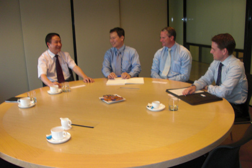 为进一步了解澳大利亚矿业投资的相关法律法规,做好入股王朝公司前期的财务会计工作,11月30日,陈茂春董事长在布里斯班市,与国际上享有很高的声誉毕马威会计师事务所的合伙人Stephen Abbott、高级经理吴晔昀举行会谈,了解澳大利亚矿业资本市场,熟悉“在澳大利亚拥有矿业权即可上市融资”的基本运作实务。