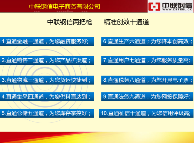 中联钢信一手抓资源,一手抓金融,打通金融、销售、物流、集采、仓储、生产、用户、税务、法务征信十条通道,为加入中联钢信电商平台的股东企业提供金融支持服务、产品销售服务、大宗采购服务、数据分析服务、和股权政策红利。零风险、增值快,共筑价值网络,共创价值增量,重组财富抱团,实现财路共赢。