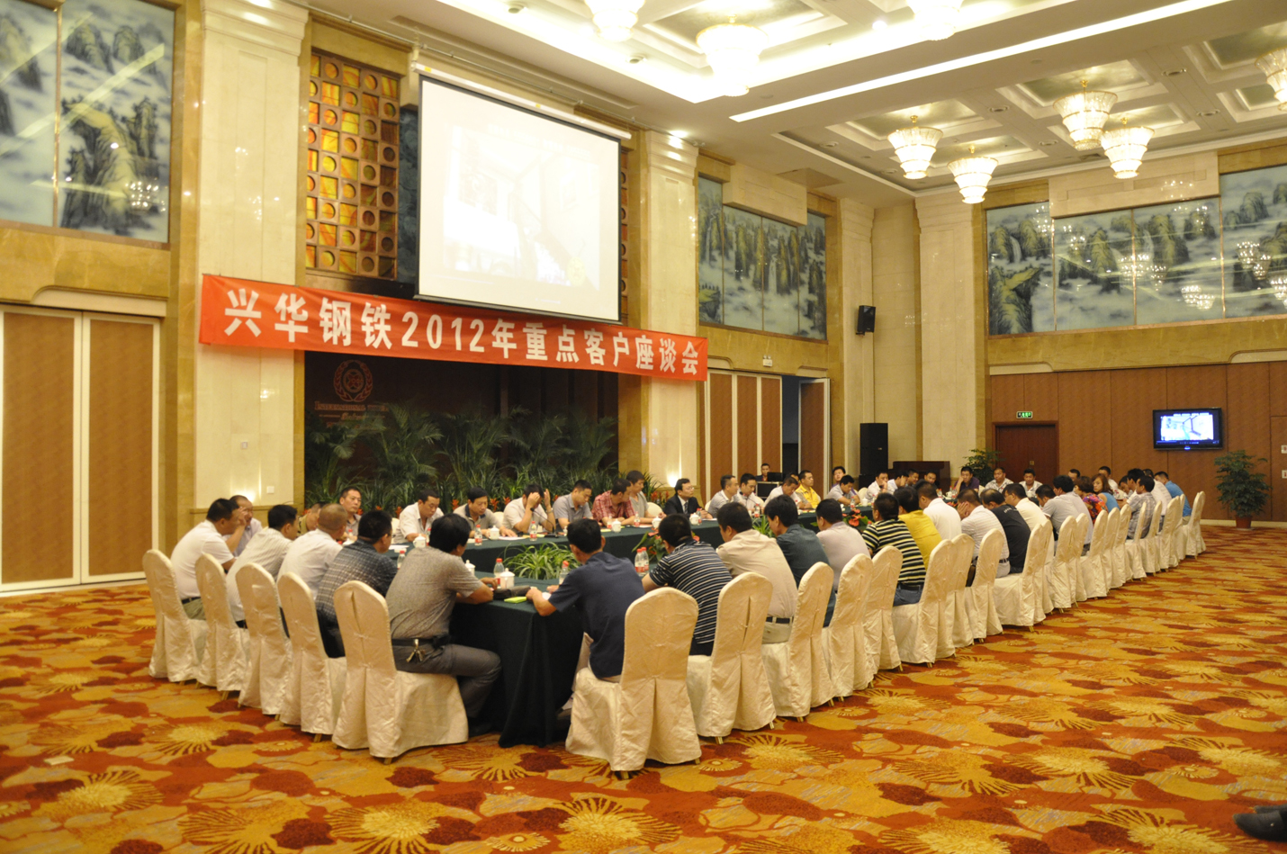 8月3日下午4点半,在酒店三楼多功能厅召开“兴华钢铁2012年重点客户座谈会”,出席此次会议的有:兴华财富集团总经理李福忠、兴华财富国际酒店总经理高振伟、兴华钢铁经营部门领导及长期以来与兴华合作的重点业务单位负责人,会议的主题是“协同合作 财富共享”。