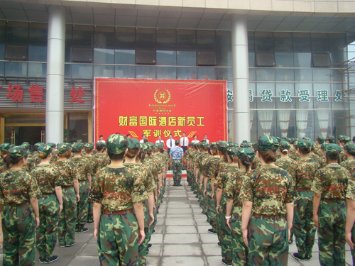 本报讯:7月10日,财富国际酒店在财富广场举行酒店新员工军训仪式,公司董事长陈茂春、总经理李福忠、生产副总付新岗、房地产公司总经理田昊、财富国际酒店公司常务副总经理刘克、国际贸易部常务副部长孙晓冬以及项目总监李钟雄、工程总监余长山参加了仪式活动。仪式由房地产公司副总经理赵耿主持。